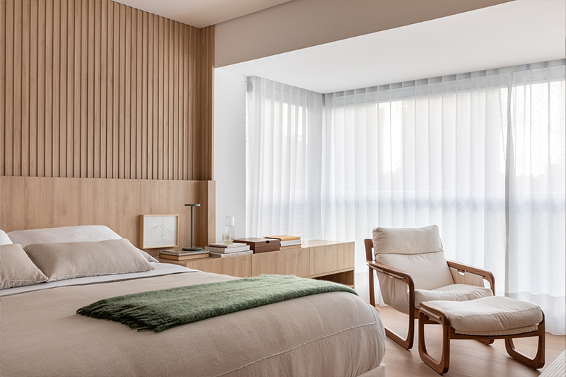 No projeto de 284 m² assinado pela arquiteta Ticiane Lima, a suíte master tornou-se o coração silencioso do apartamento, um refúgio pensado para acolher o casal após dias de receber amigos, abrir vinhos especiais, preparar churrascos e acompanhar partidas de futebol, hobbies que moldaram toda a concepção da residência. Atendendo ao desejo dos proprietários por amplitude, luz natural e integração, Ticiane uniu a suíte principal à varanda, criando um ambiente contínuo, fluido e generoso. Materiais quentes e sensoriais, como madeira natural, tecidos com textura e revestimentos que trazem profundidade, compõem o cenário que equilibra sofisticação e descanso.