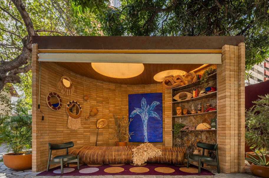 Tijolos ecológicos foram usados para criar este projeto com formas sinuosas – Foto: Felipe Petrovsky/CASACOR | Projeto: Stephanie Ribeiro