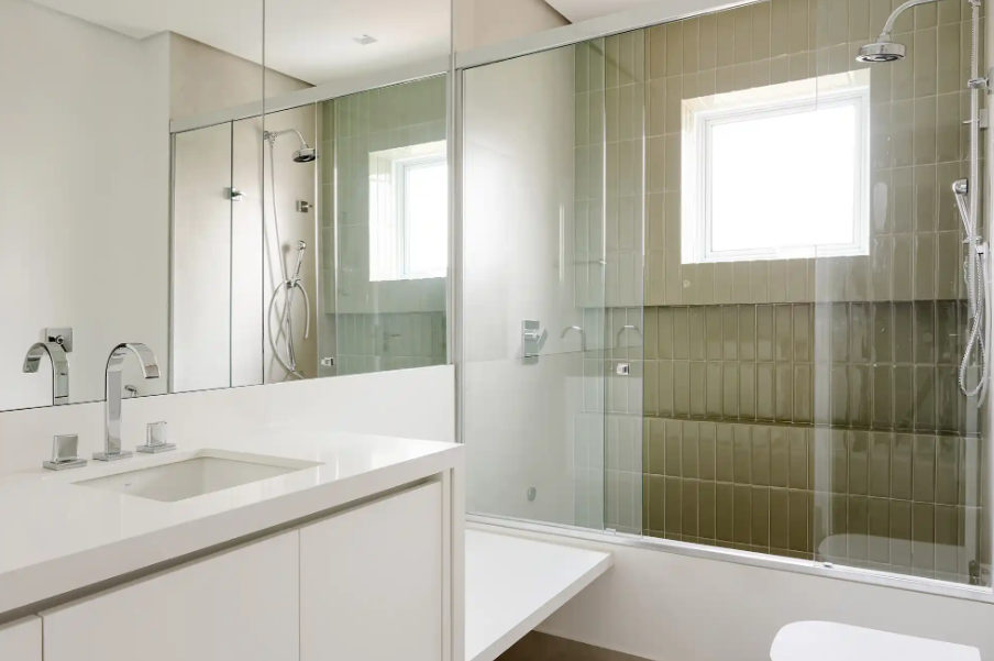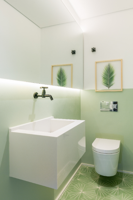 Banheiros e lavabos são ótimos ambientes para arriscar com o verde. A metragem reduzida permite usar tons intensos sem comprometer o conjunto, pois a cor fica contida em um espaço delimitado. Por isso, muita gente escolhe esses cômodos para experimentar tonalidades mais vibrantes.