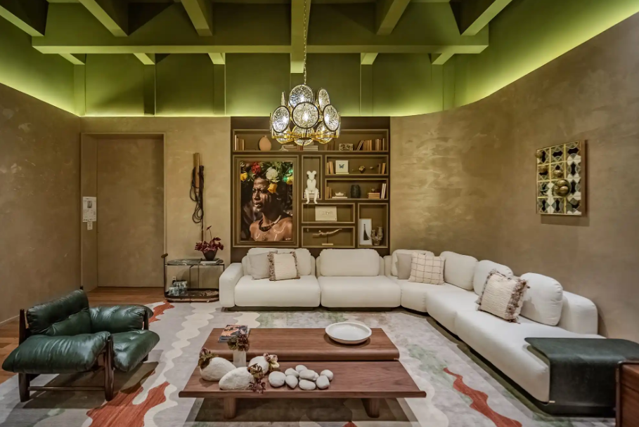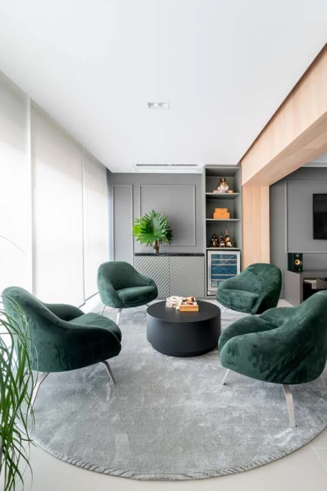 Na sala, o verde pode aparecer primeiro nos estofados. Sofás, poltronas e puffs nessa cor trazem personalidade ao ambiente sem competir com os demais elementos. Quem prefere algo mais sutil pode investir em tapetes, cortinas, mantas e almofadas, que permitem testar a cor antes de assumir um compromisso maior.