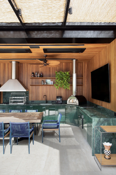 Além disso, tons escuros, como musgo e floresta, trazem sofisticação e combinam muito bem com madeira e metais dourados ou pretos. Já tons claros equilibram ambientes com muita luz natural e mantêm a leveza visual, especialmente quando o espaço gourmet é integrado à área de lazer.