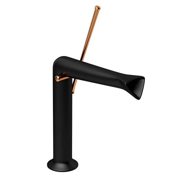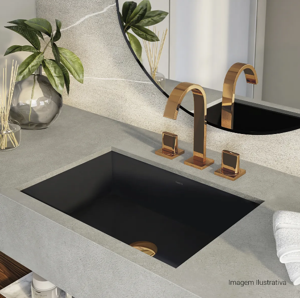 Para ambientes que apostam em composições mais inusitadas, o contraste entre o preto fosco e o dourado avermelhado combina com cubas de apoio sem mesa, mármores escuros e iluminação direcionada. É o tipo de peça que define o estilo do banheiro sozinha.
