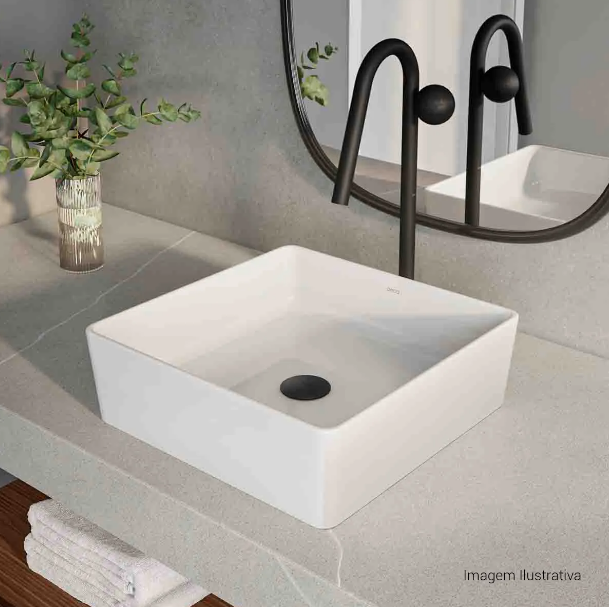 Indicada para projetos contemporâneos e minimalistas, essa torneira para banheiro da Deca combina com cubas de apoio sem mesa e revestimentos em porcelanato cinza ou cimento queimado. Louças brancas ao redor criam um contraste limpo com o dark antracite.