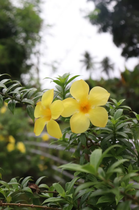 Flores amarelas vibrantes marcam a alamanda. Por ser sarmentosa, precisa ser conduzida e amarrada ao suporte no início. Para florir bem, necessita de sol pleno e podas regulares. Na poda, pode escorrer uma seiva branca tóxica que irrita a pele, então use luvas e mantenha longe de boca e olhos, sobretudo de crianças e pets.