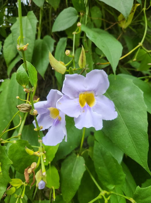 A tumbérgia cresce rápido e cobre muros e pergolados com facilidade. As flores azul-arroxeadas, em formato de sino, aparecem em ramos pendentes. A espécie pede sol pleno, irrigação mais frequente no início e suporte firme para sustentar o peso dos ramos.