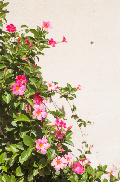 A dipladênia gosta de calor e produz flores tubulares quase o ano todo. É uma trepadeira volúvel e de crescimento fácil de controlar. Além disso, tolera seca, prefere solo leve, bem drenado e regas regulares sem encharcar.