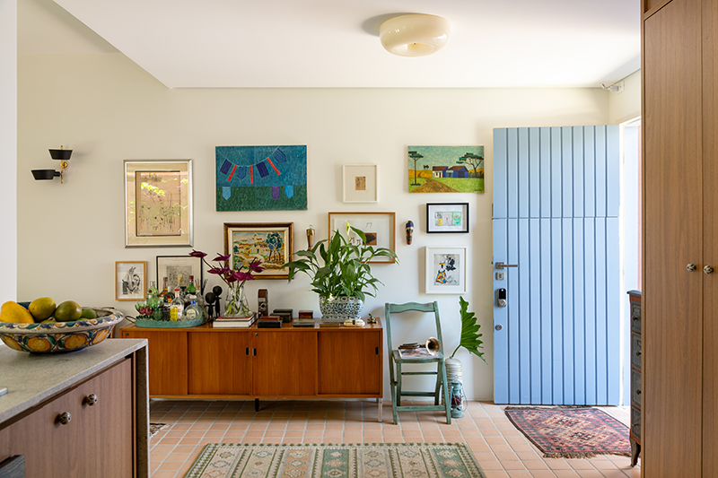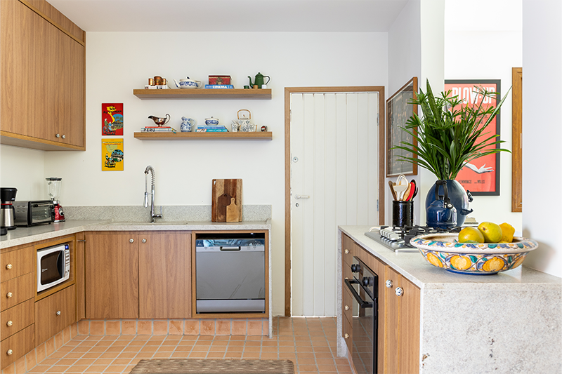 Na decoração, o projeto valoriza a memória e o afeto. Grande parte do mobiliário e dos objetos veio da residência anterior, reunindo peças de família e itens com valor emocional. O resultado é uma casa viva e alinhada com a identidade das moradoras, onde arquitetura, paisagem e escolhas funcionais se encontram de forma natural.