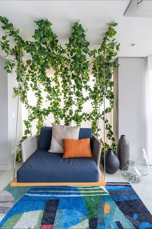Sabrina Salles comandou reforma de projeto de 180m2 no bairro de Santana, em São Paulo, com varanda charmosa que conta com balanço aconchegante e plantas pendentes. A paleta com base neutra valoriza os elementos em azul como o tapete com estampa abstrata.