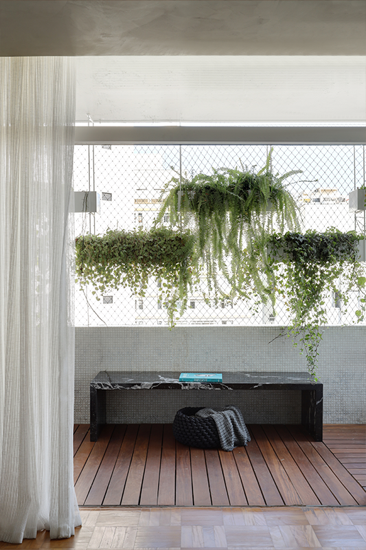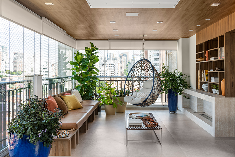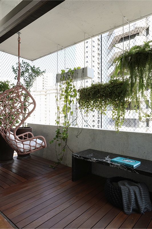 Assinado pelo escritório TT Interiores, comandado pelas irmãs Tássia e Thaisa Pereira, o apartamento de 250 m2 combina elegância, funcionalidade e conforto. A varanda não poderia ser diferente, revestida por materiais naturais, o local estimula a convivência com poltrona suspensa, vegetação e mobiliário em madeira.