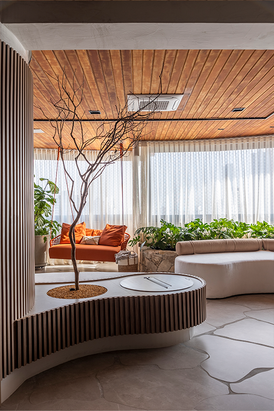 Cilene Lupi criou um refúgio contemporâneo com materiais naturais, mobiliário orgânico e teto em madeira. A varanda, com sofá suspenso em tom de laranja, rompe a neutralidade da paleta e estabelece um diálogo vibrante com o paisagismo, cenário ideal para relaxar e apreciar o entorno.