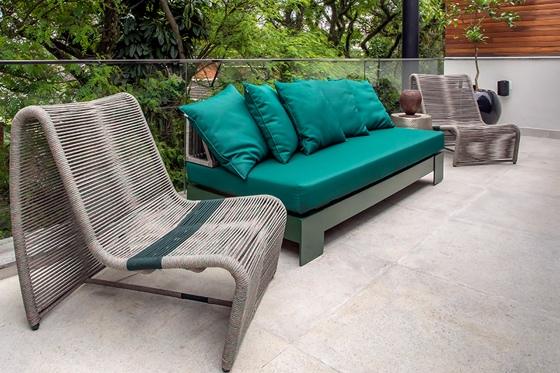 Em outro projeto, a arquiteta aproveitou o espaço descoberto para criar um cantinho de estar, com poltronas confortáveis e um sofá resistente para áreas externas. Integrado ao verde, é o espaço perfeito para aproveitar o ar livre, o sol e a natureza!