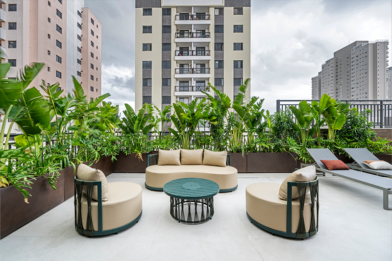O paisagismo foi pensado para trazer privacidade, já que o entorno é cercado de prédios, criando um espaço acolhedor e reservado.