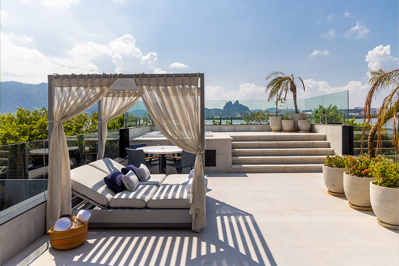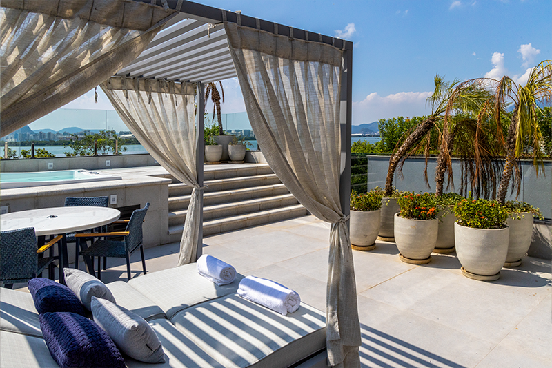 Nesta casa de veraneio na Barra da Tijuca, também um projeto da arquiteta Érica Salguero, os ambientes traduzem o espírito leve e solar do Rio de Janeiro com varanda que conta com bangalô, feito para momentos de puro relaxamento, uma extensão natural do clima de férias.